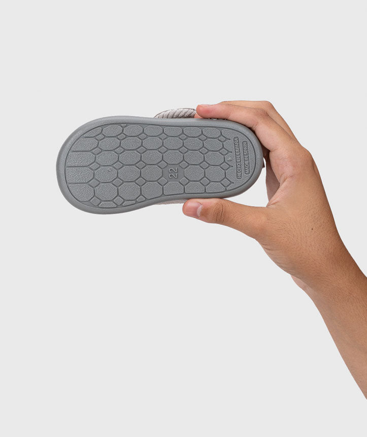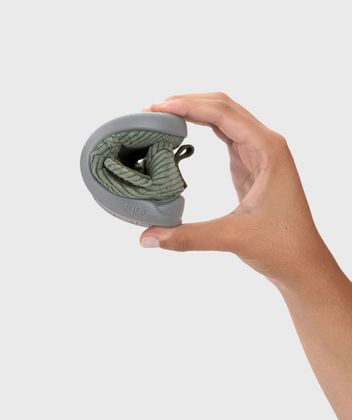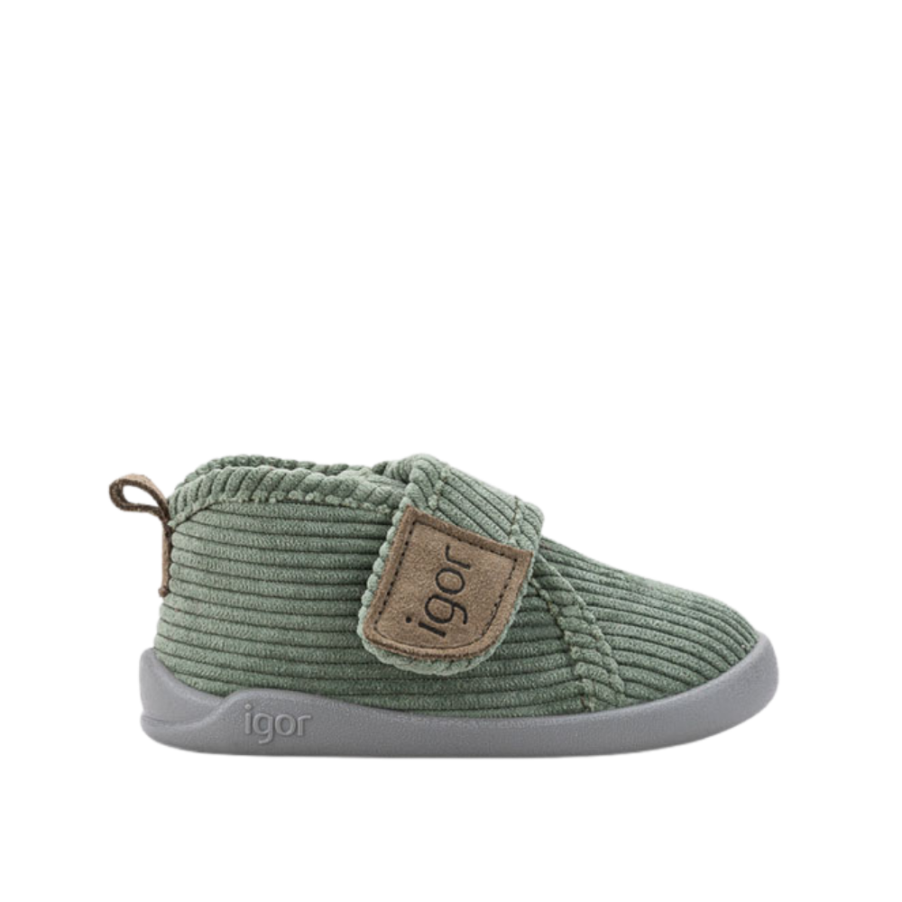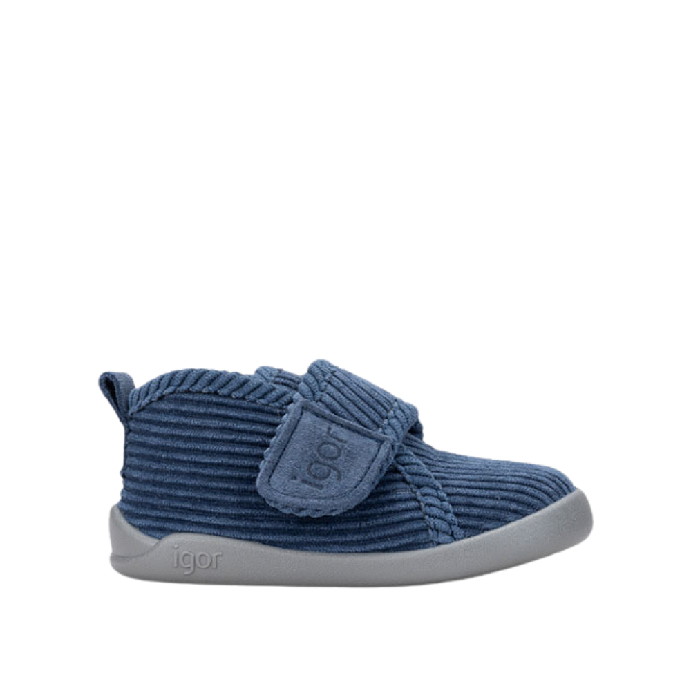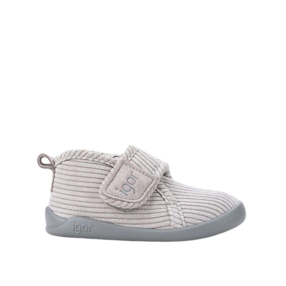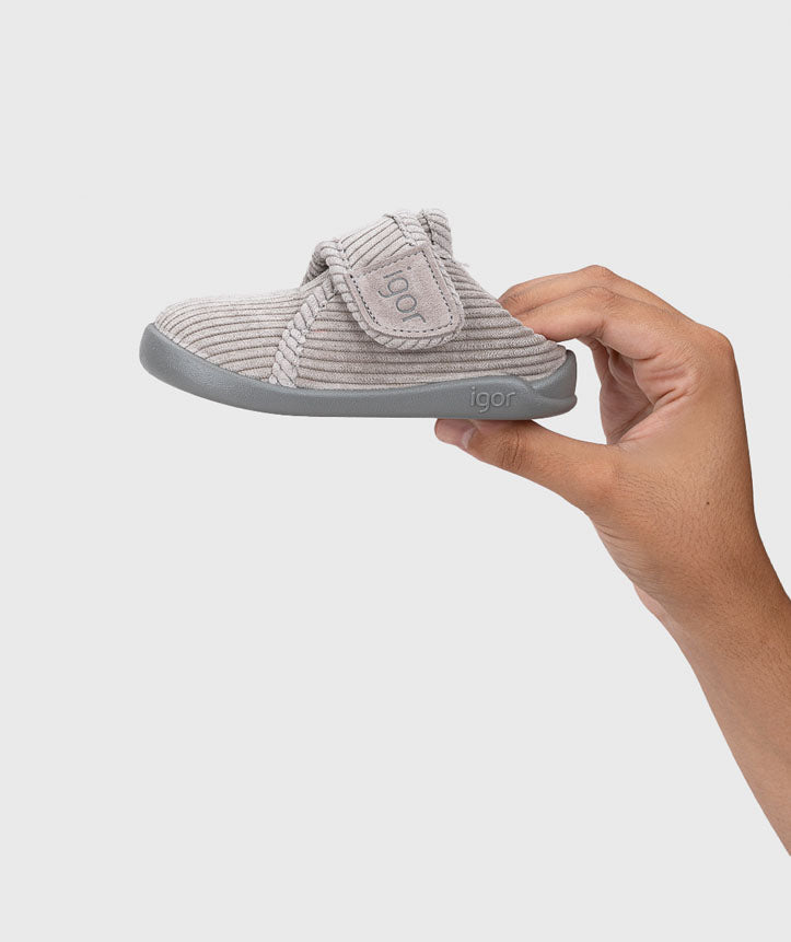 Zapatilla de estar por casa para niños y niñas, de concepto barefoot, cero drop, flexible, blandito, cierre adherente y fabricada en un tejido de pana súper suave.