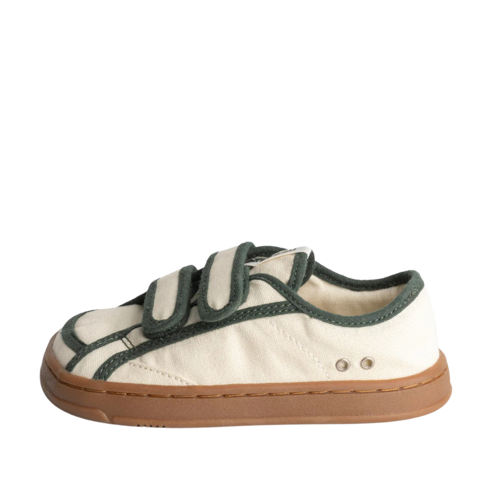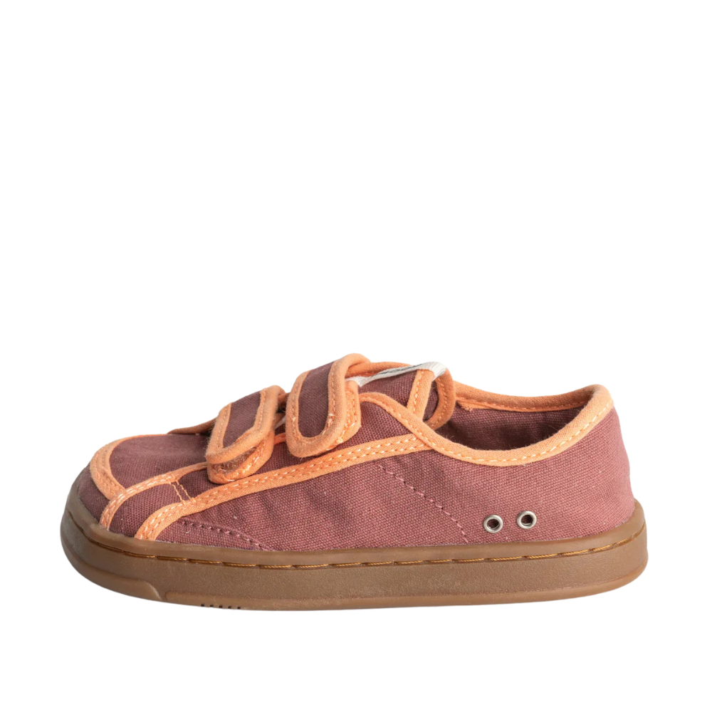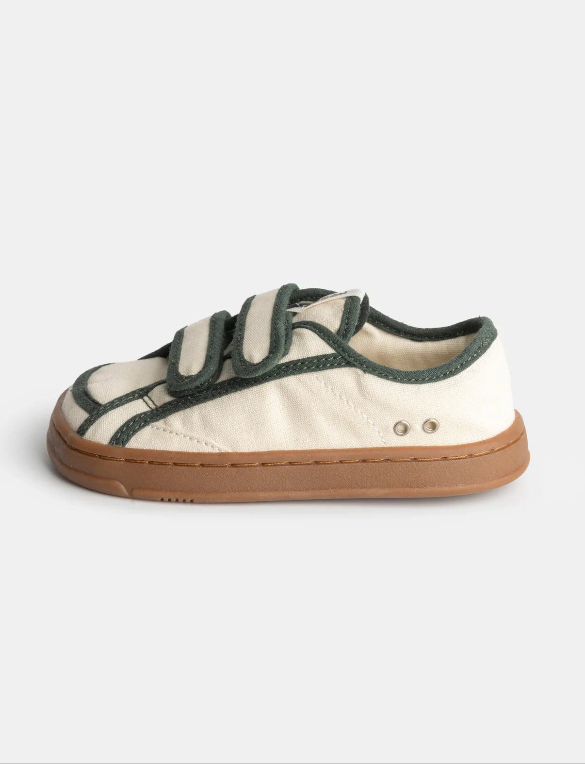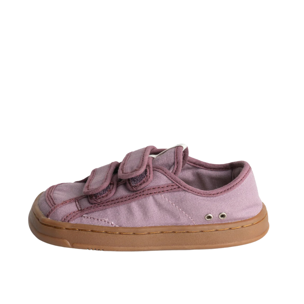 Zapatilla barefoot vegana y ligera para niños, con puntera ancha, suela plana y flexible que favorece el movimiento natural del pie. Ajuste con velcro para mayor autonomía. Fabricada en Europa con lona de algodón y suela de caucho reciclado.