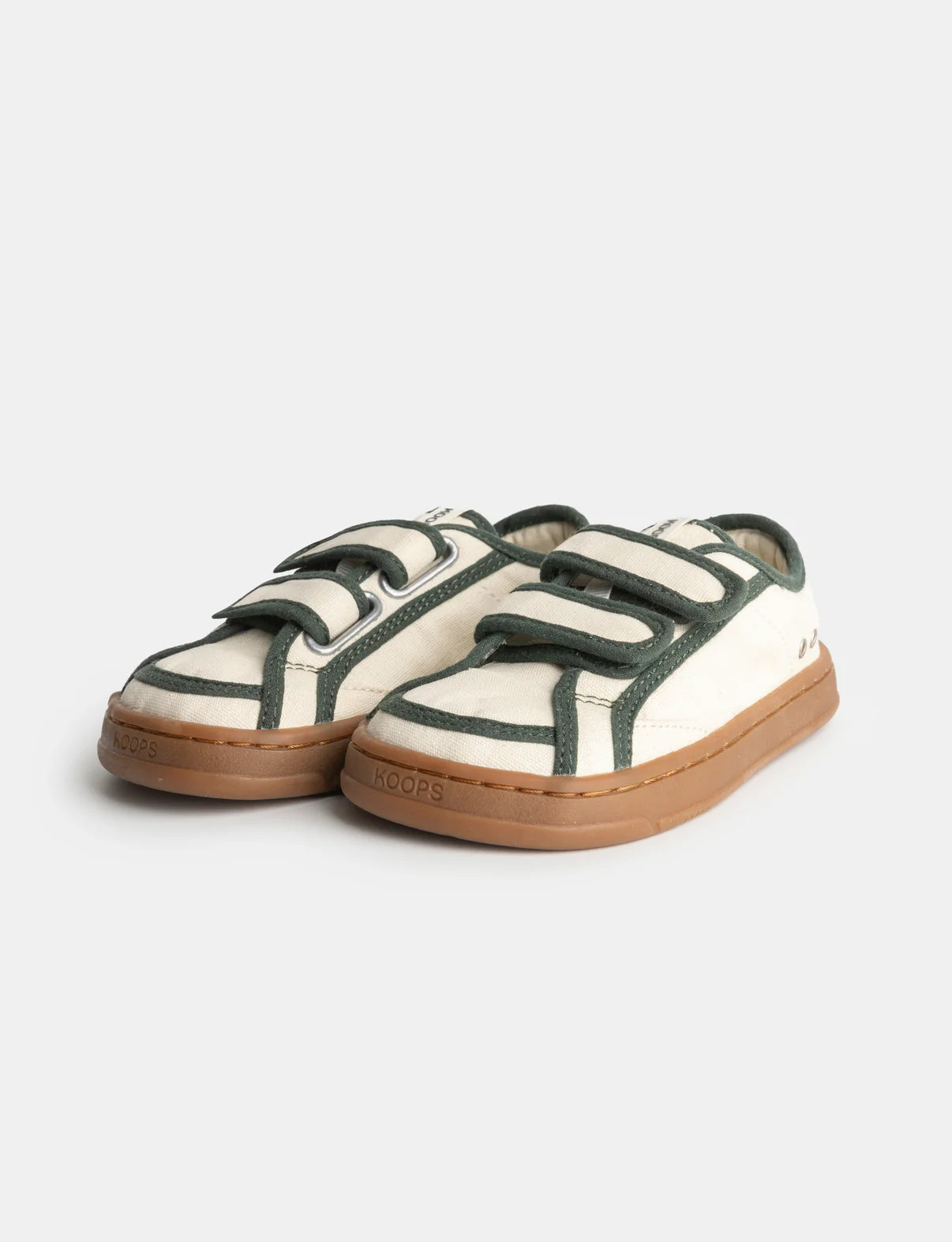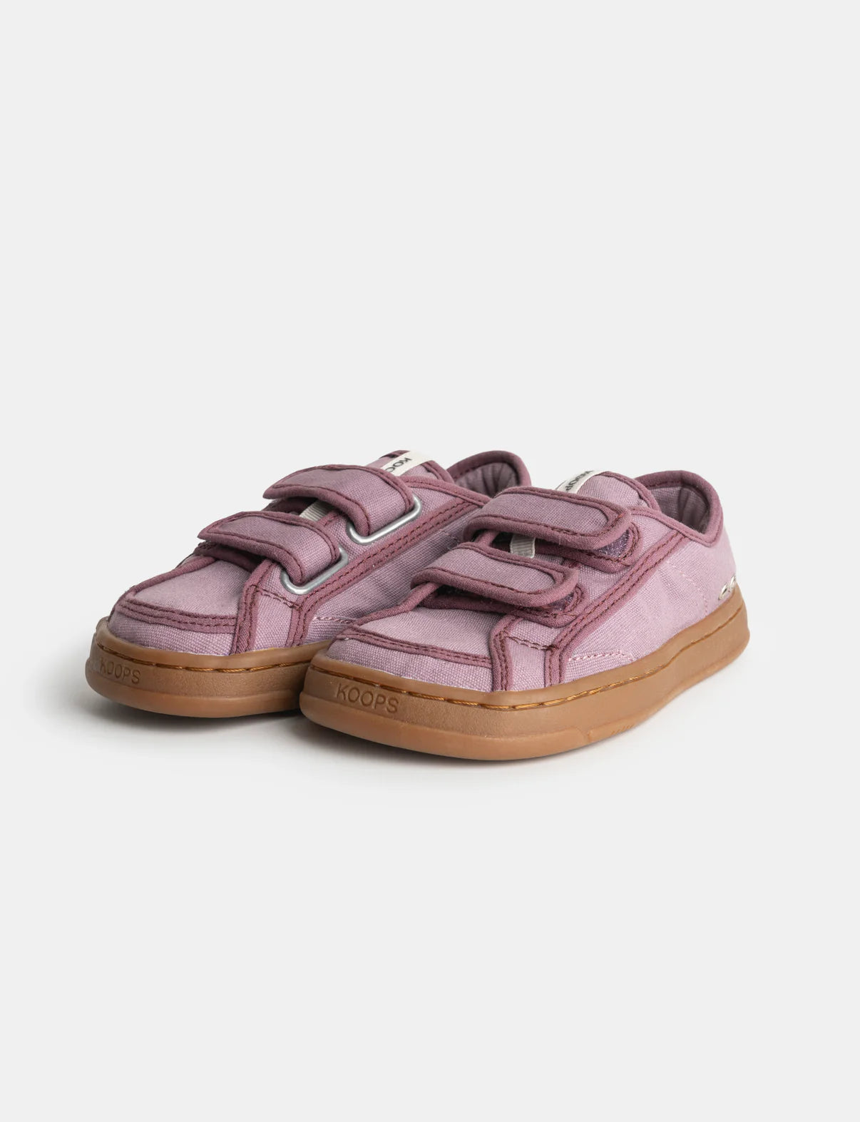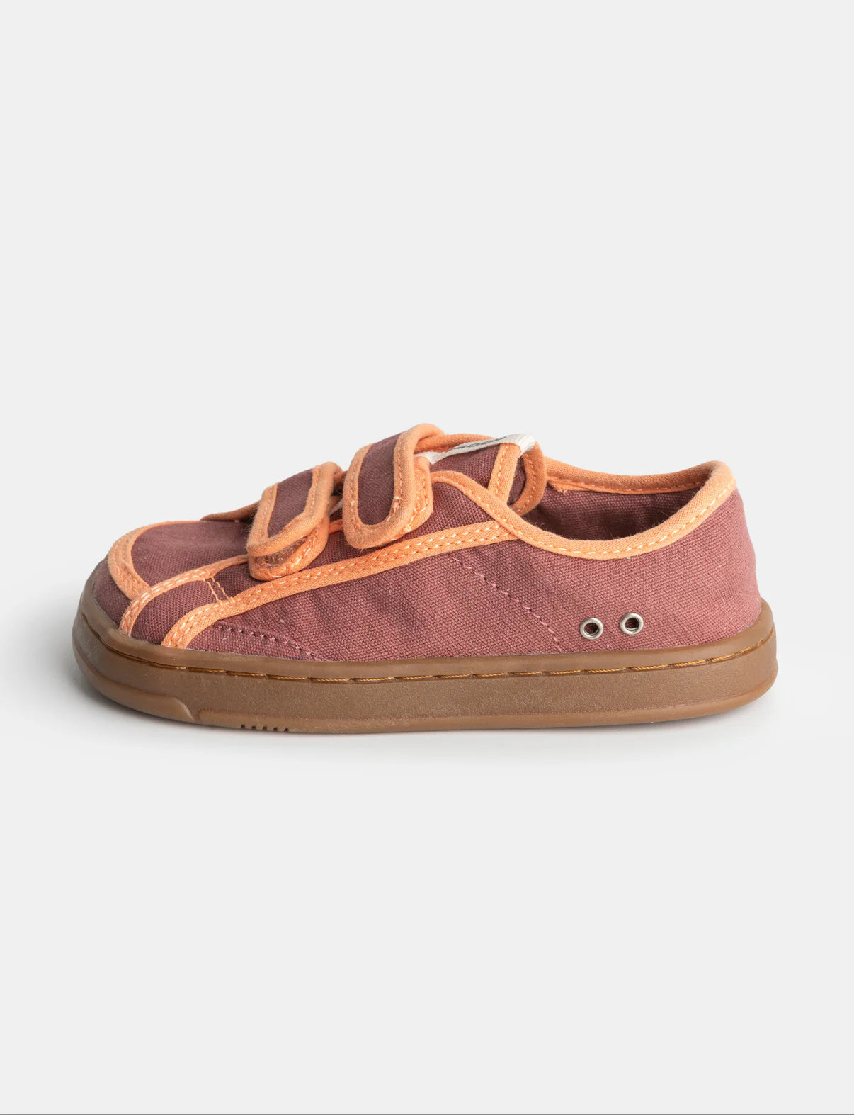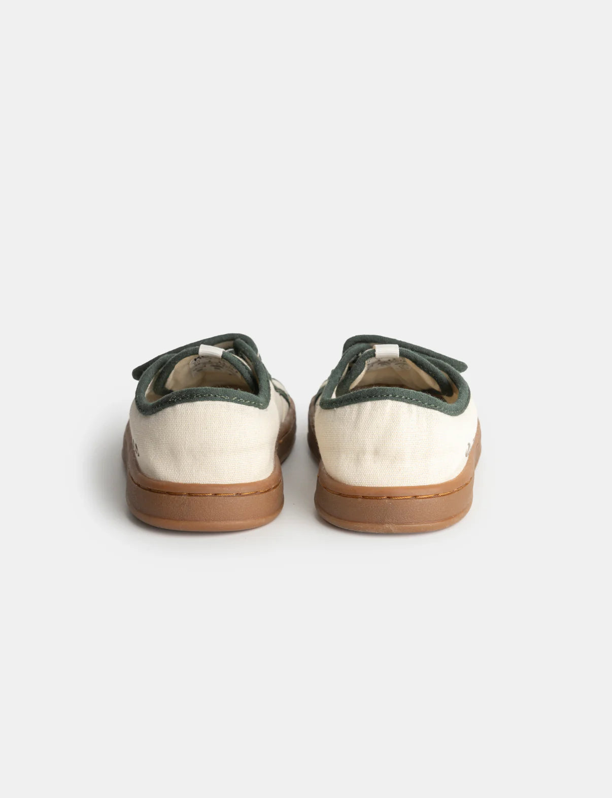 Zapatilla barefoot vegana y ligera para niños, con puntera ancha, suela plana y flexible que favorece el movimiento natural del pie. Ajuste con velcro para mayor autonomía. Fabricada en Europa con lona de algodón y suela de caucho reciclado.